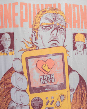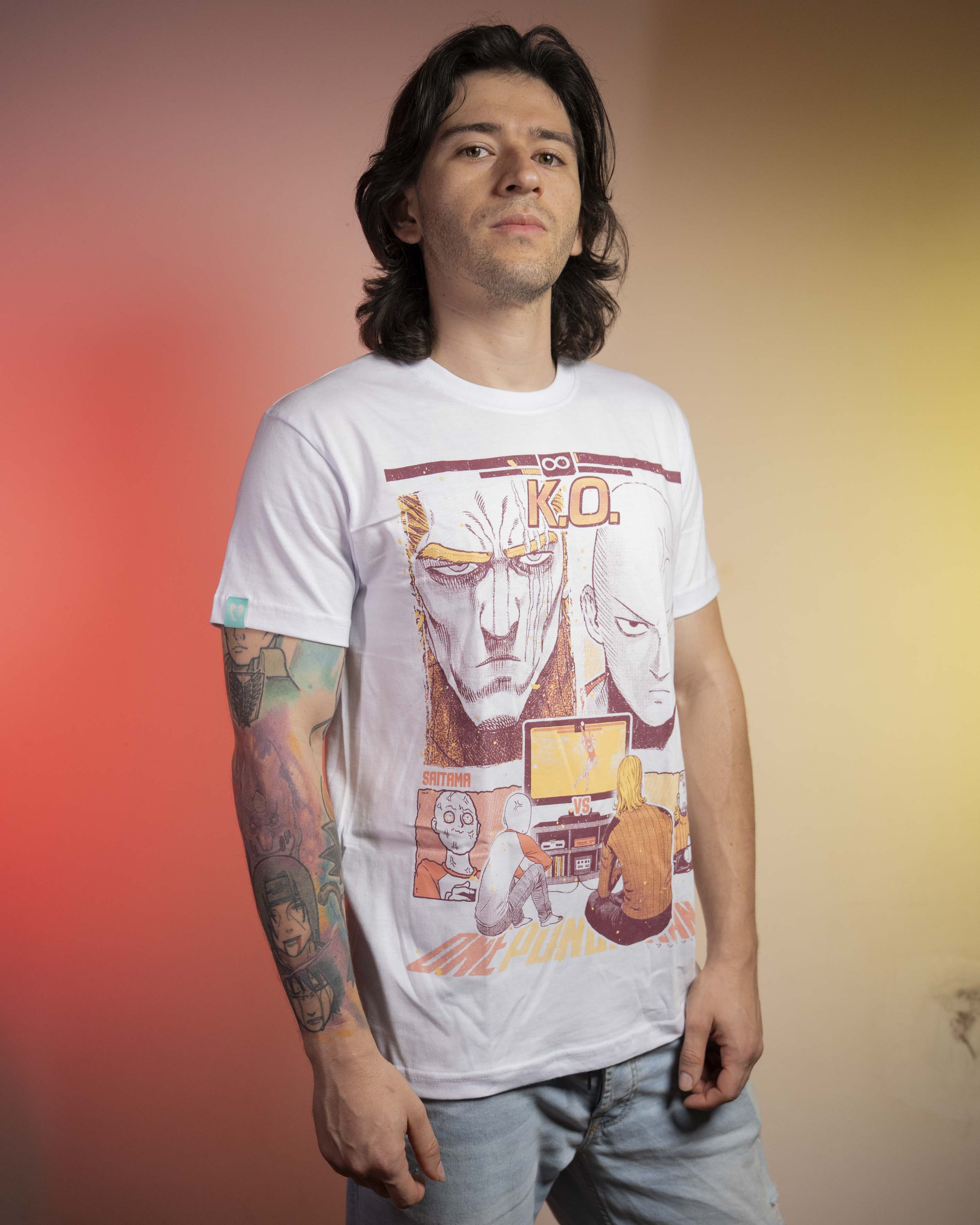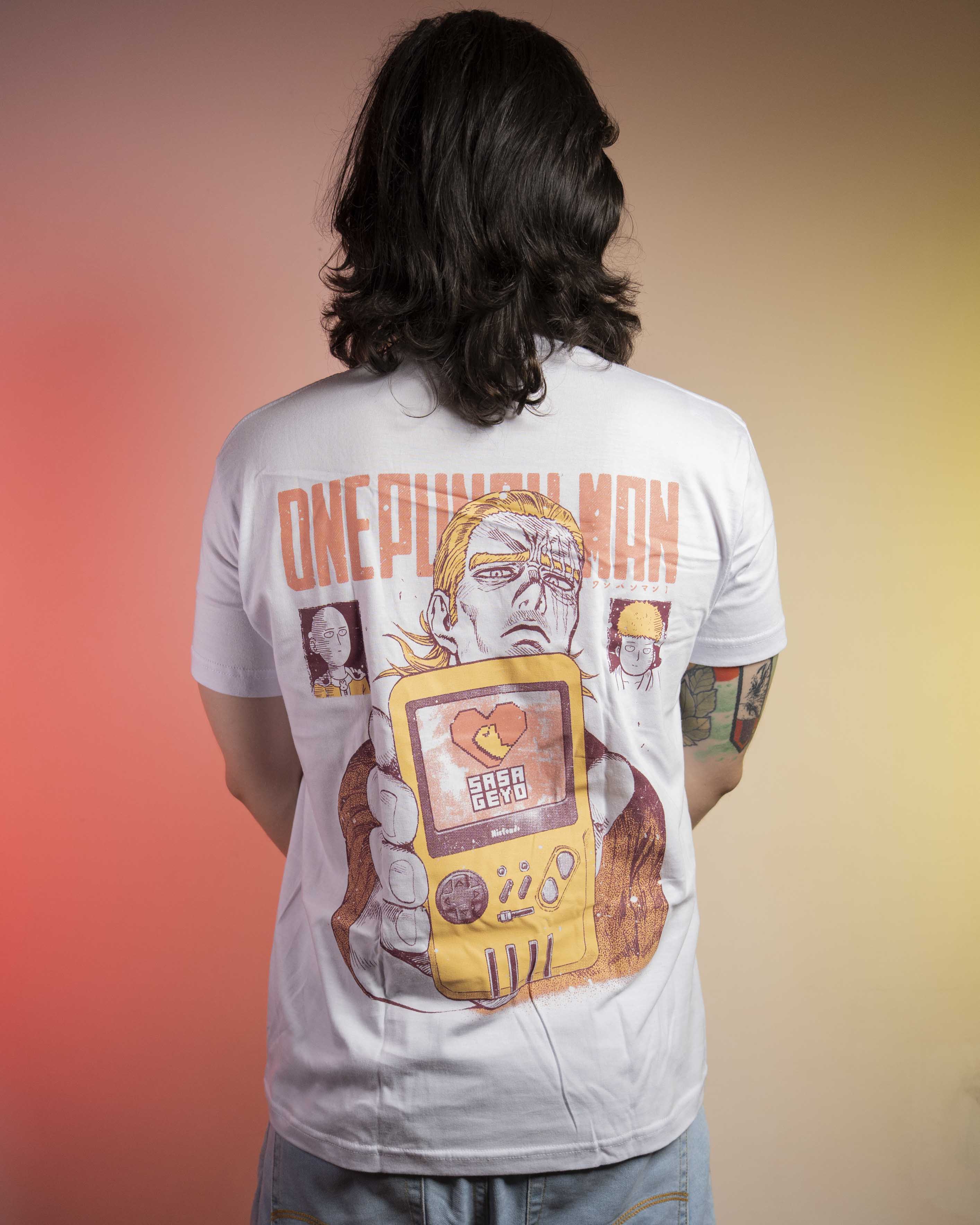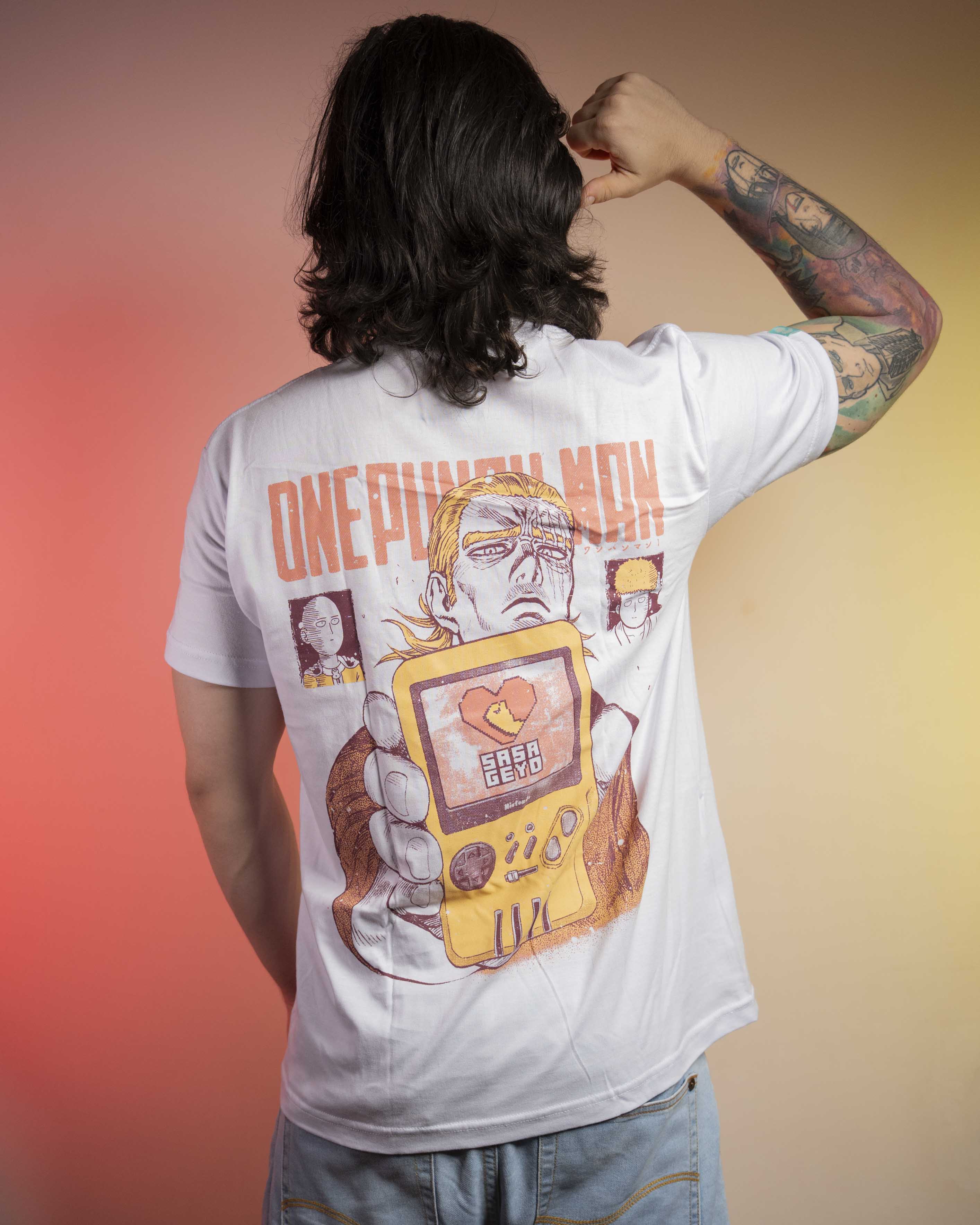 Esta camiseta captura la escena más icónica y absurda de One Punch Man: Saitama 🥊 y King 👑 dándolo todo… frente al PlayStation 🎮.